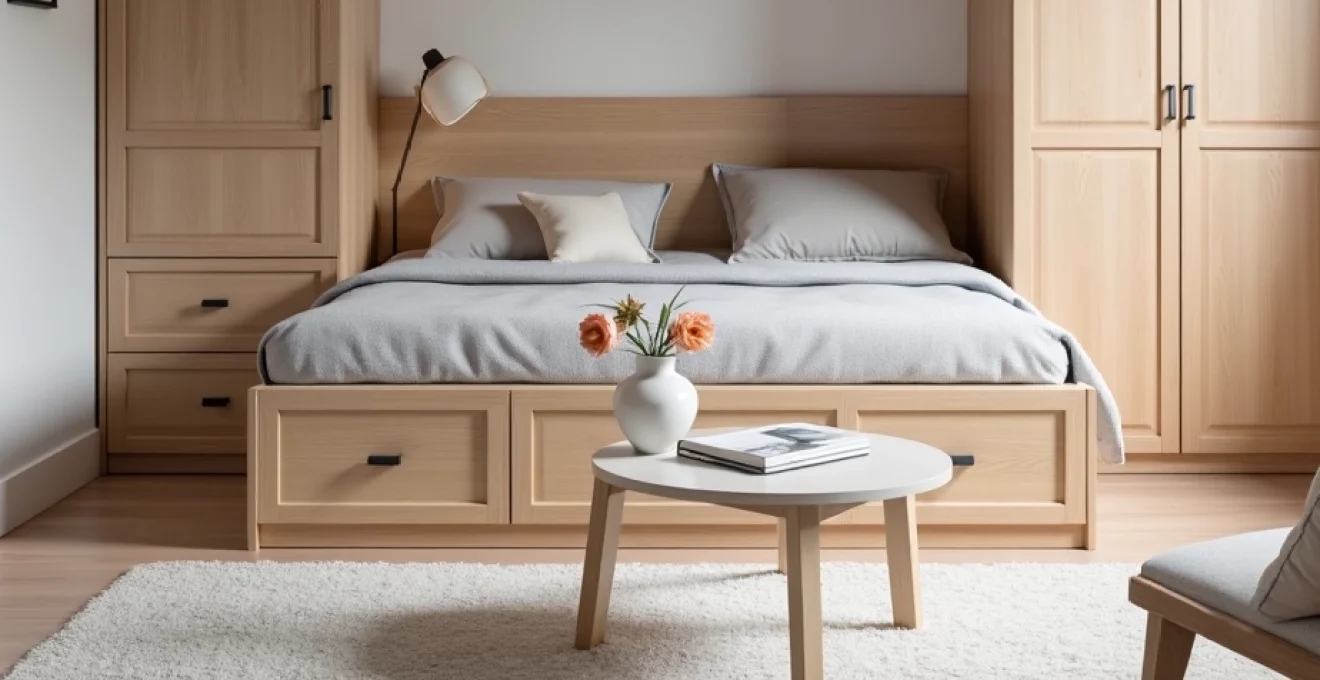 Dans les espaces très restreints comme les studios, le lit coffre escamotable est l’ultime moyen de maximiser l’espace. Ce système astucieux permet de transformer en un instant une pièce de vie en chambre à coucher. Le lit se replie verticalement contre le mur, libérant l’espace pendant la journée. Le coffre de rangement reste accessible même lorsque le lit est replié, une double fonctionnalité appréciable dans un encombrement minimal.